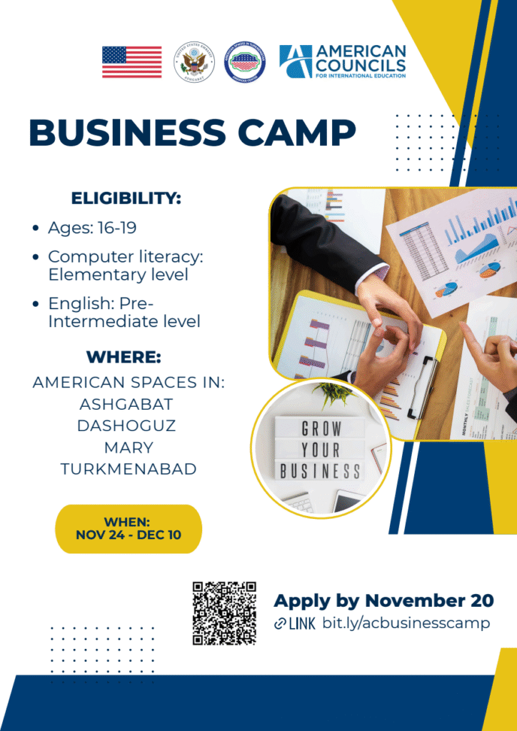 The Business Camp project will be conducted across all four American Spaces with the goal of educating and inspiring high school students to explore U.S. business practices, analyze global challenges, and take their first steps toward becoming future leaders. By the end of the program, participants will have developed the skills to design a creative and practical business plan based on U.S. business models, and present their ideas confidently before a panel of judges. This project will be held in English in Ashgabat, Turkmenabat, Dashoguz, and Mary American Spaces from November 24 and 26, 2025, until December 10, 2025 (tentative).