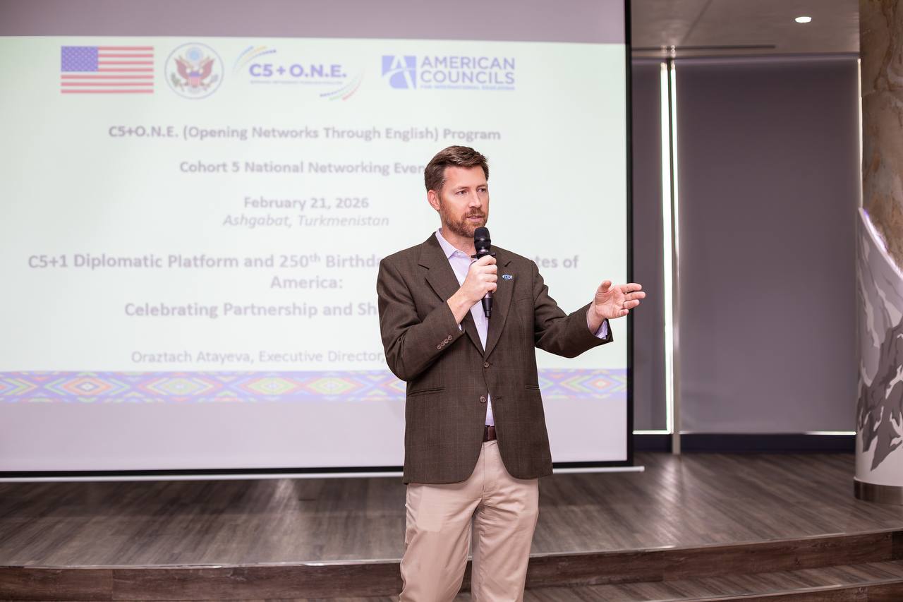 The event opened with welcoming remarks from Daniel Riffle, Public Diplomacy Officer at the U.S. Embassy Ashgabat, followed by program leadership. Speakers highlighted the strategic role of English-language programming in strengthening professional capacity, supporting cross-sector collaboration, and advancing shared U.S.–Central Asia priorities. Remarks also recognized the broader context of the C5+1 partnership and the milestone of the United States’ 250th anniversary, underscoring the enduring foundations of cooperation and mutual engagement.